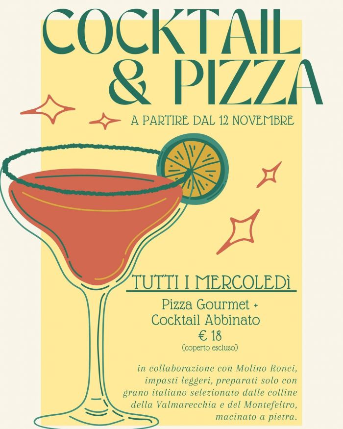 La serata Cocktail & Pizza nasce dall'idea di creare abbinamenti non convenzionali che valorizzino tanto l'impasto quanto le preparazioni liquide. Gli impasti utilizzati sono realizzati con farine macinate a pietra, una scelta che permette di mantenere intatte le proprietà organolettiche del grano e di ottenere pizze dalla consistenza leggera e dal sapore autentico. La macinazione a pietra del Molino Ronci preserva il germe di grano e gli oli essenziali, conferendo agli impasti maggiore digeribilità e un profilo aromatico distintivo.